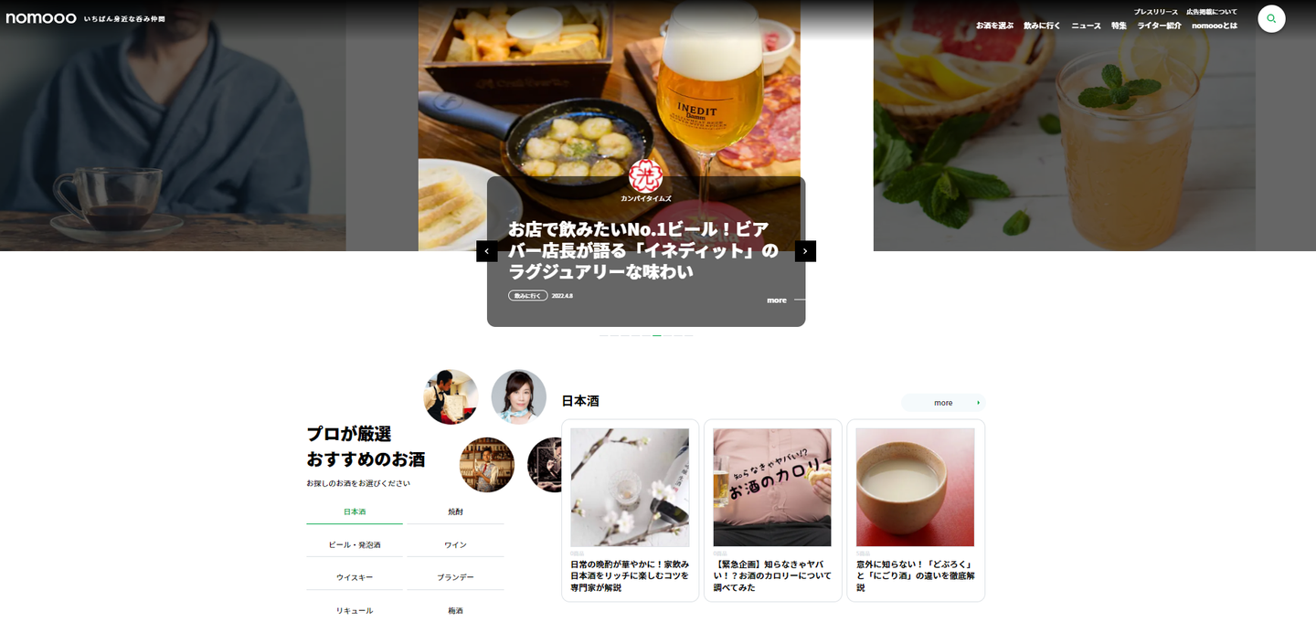 杉山さんが事業責任者を務めるnomooo。「お酒のある生活をもっと楽しく」をコンセプトにお酒にまつわる情報を発信している。