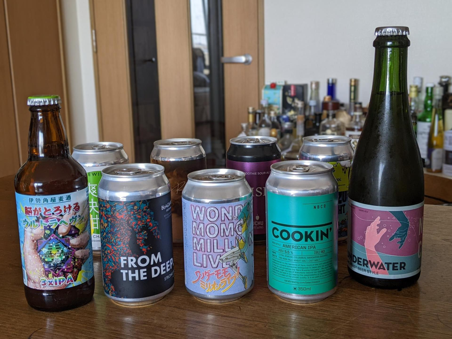 杉山さん宅のお酒コレクション。奥にも酒瓶が並んでいる。