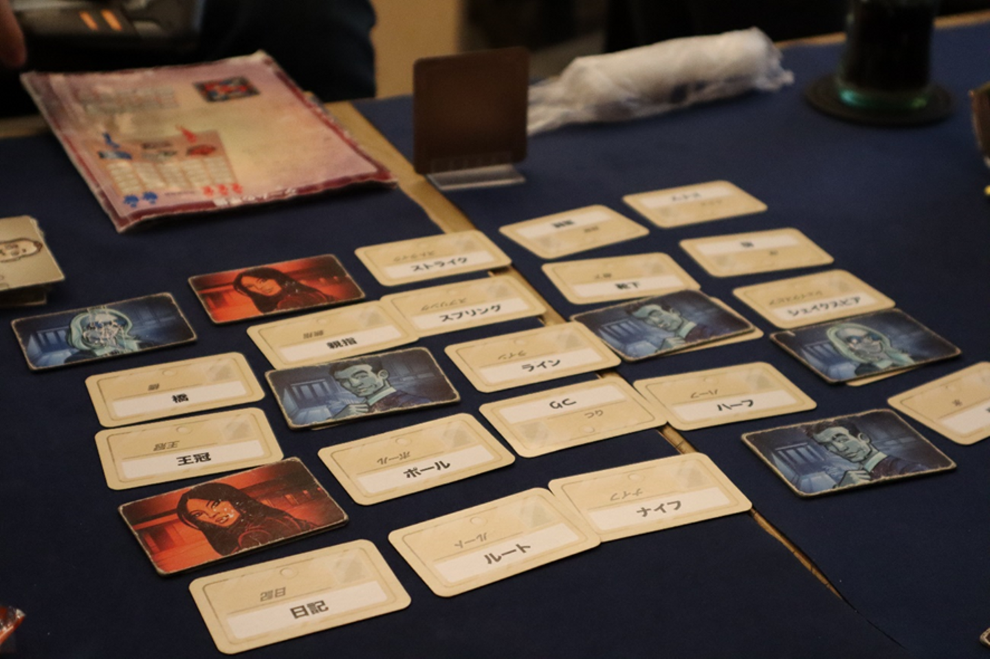 最初に遊んだのはボードゲームの定番「コードネーム」。ゲームマスターは単語一つのヒントをプレイヤーに伝え、25枚のカードの中から正解を見つけ出します。