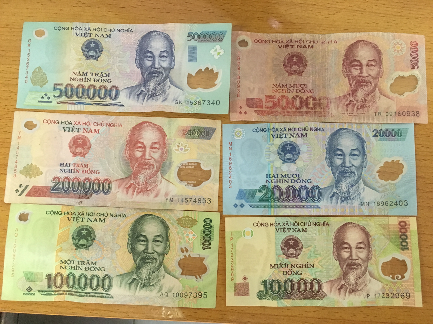 左下の緑色をした100,000(10万)VNDが、大体500円。
