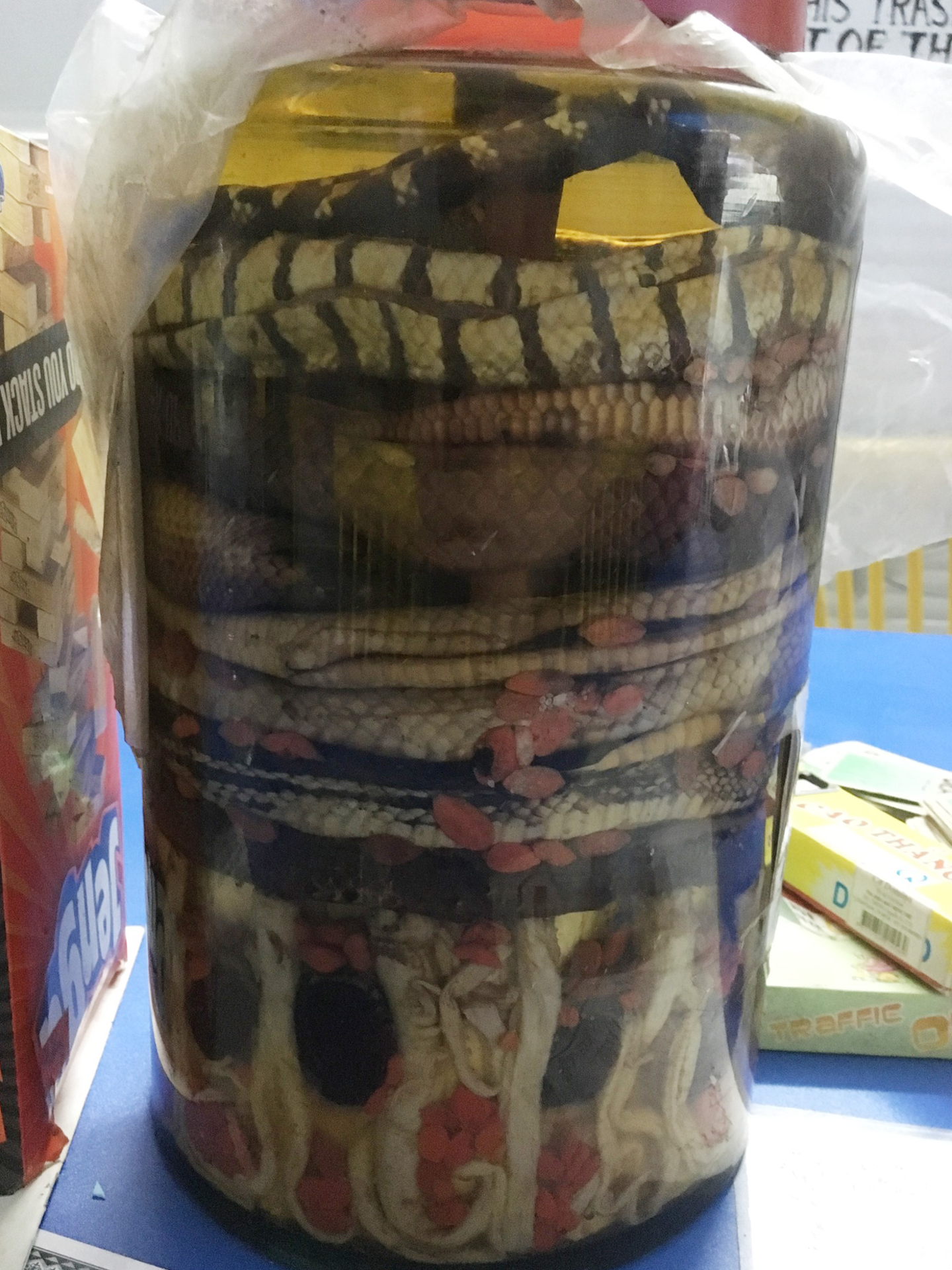 カエルと来て、ヘビ。ヘビ酒。しかもこれ、一匹だけでなく、これでもかと大量にぐるぐる巻きでギュウギュウに漬けられていますよ…! なんか底の方、縦にもいるような。。もはや洗濯槽…。