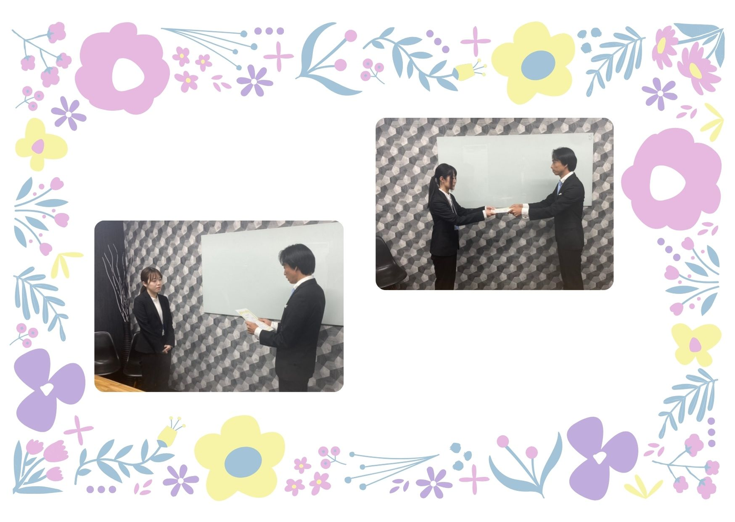 内定式では、オープニングムービーとして社歴ムービーを見てもらい、社長からの祝辞をいただき、内定証書と記念品の授与、内定者からの決意表明などが行われました!