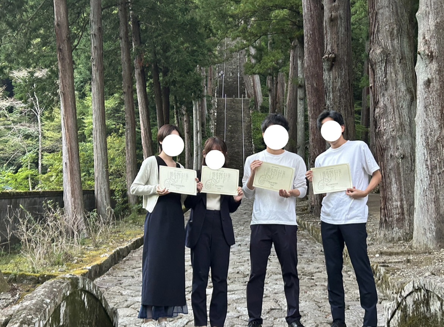 合宿2日目の朝は5時30分に集合。早朝から何をするかというと、久遠寺の朝のお勤めを見に行きます!1日目に住職の方に朝の法要は迫力がすごいから参加してみてほしいと教えていただきました。287段の石段を登って本堂に向かう途中で内定者全員で集合写真を撮りました!