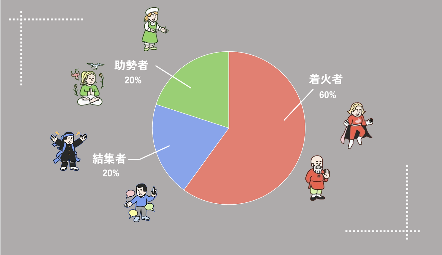 着火者:60% 結集者:20% 助勢者:20% 探求家:0%