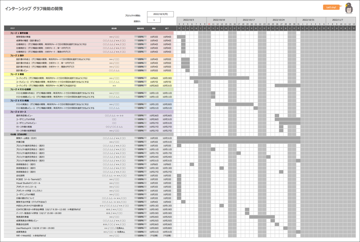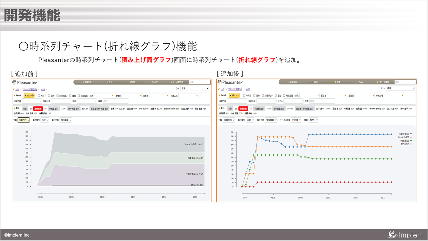 お二人を迎えるまでに、9月中に実施した顔合わせでの様子などを踏まえて、インターンを担当する開発メンバを中心に、インターンで実施する内容を検討しました。プリザンターでは今後の機能強化のひとつとしてグラフ機能の充実化があり、開発の難易度やアウトプットの結果が分かりやすいといった理由から今回の「グラフ機能の開発」を実施してもらうことに決まりました。現状のプリザンターでは登録されたデータを時系列チャートの積み上げ面グラフで表示する機能があるのですが、今回はこのグラフの種類を選択して折れ線グラフで表示する機能を追加してもらいました。