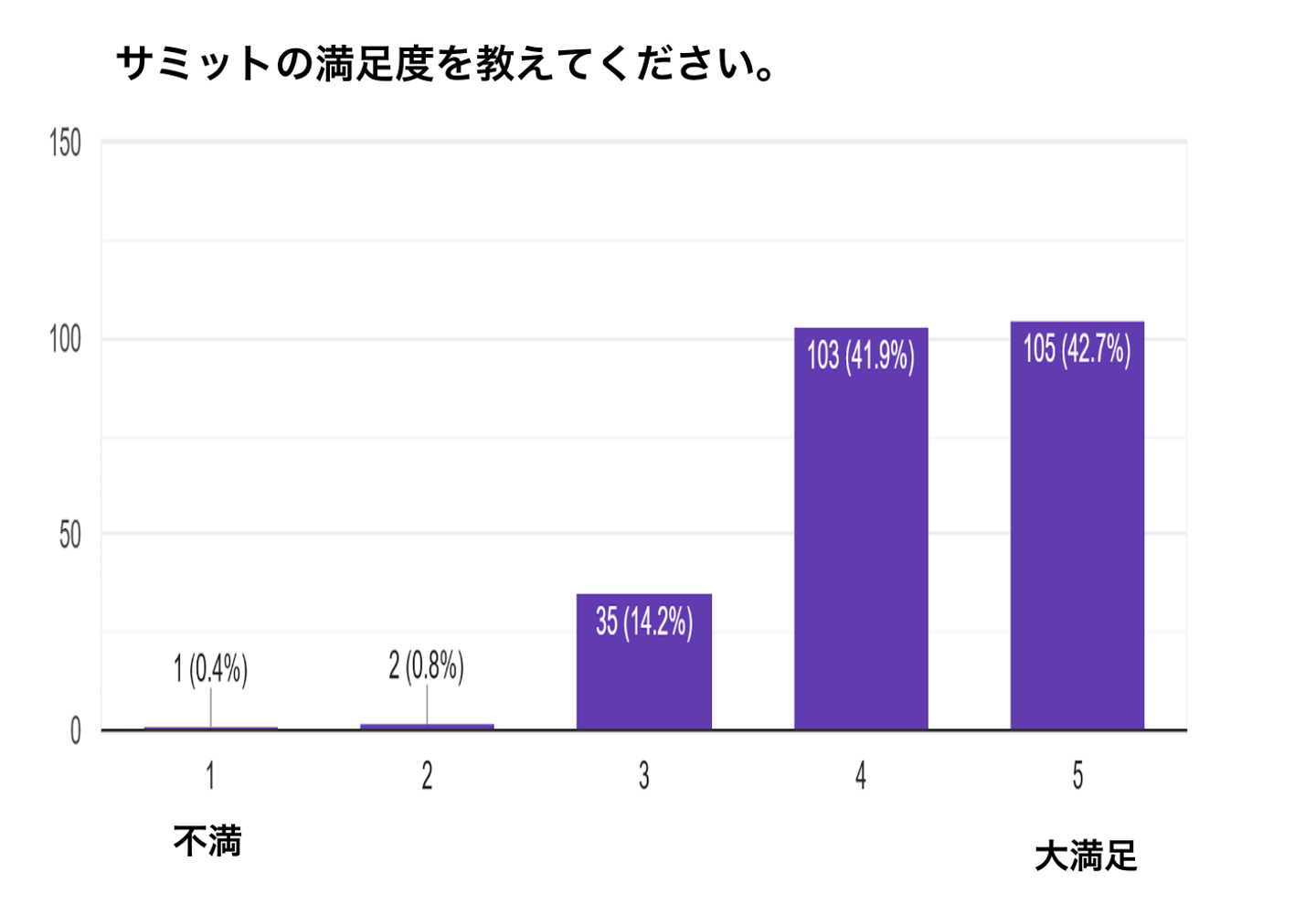 サミット終了後、参加者の皆さまにアンケートを実施しました。その結果、アンケート回答者全体の84.6%にあたる方が「満足(4)」または「大満足(5)」と回答されました。特に「大満足」と回答した方は全体の42.7%に達し、多くの方にとって有意義なイベントとなったことがわかり大変嬉しく思います。