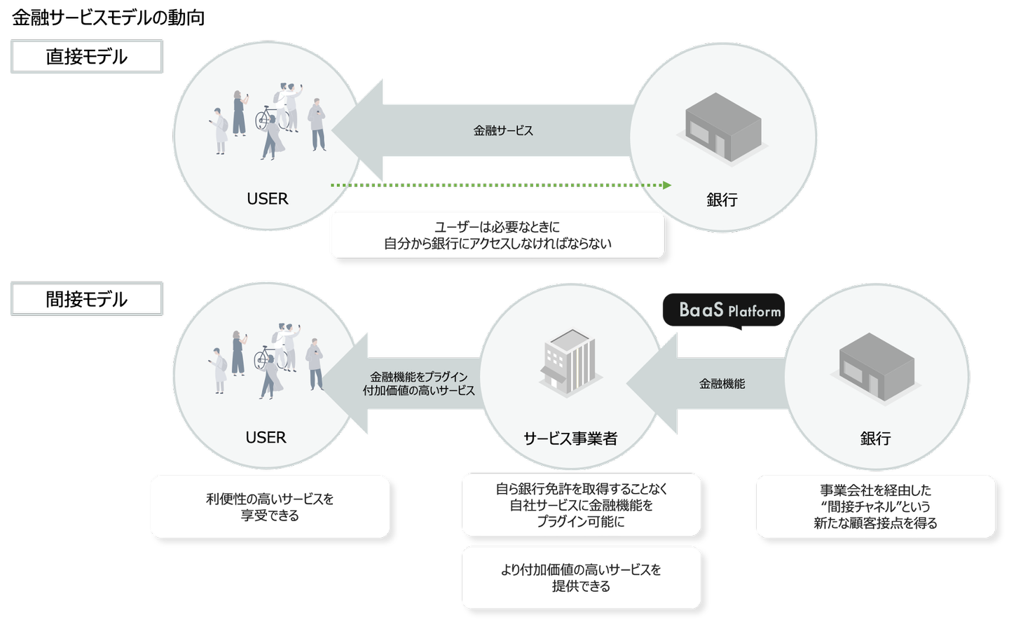 これまでは銀行が消費者に直接金融サービスを提供してきていた(直接金融)が、決済機能を個別に切り出して〇〇Payなどを事業会社のサービスに組み込む(Embedded Finance=組み込み型金融)動きが出てきた