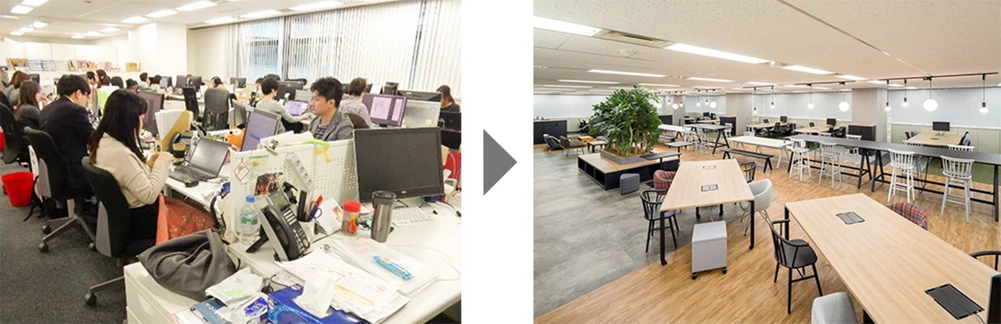 社員一人につき一つの机が割り当てられ島ごとに並ぶ「テーラリスト・オフィス」型だった改装前(なつかしい……)。改装を機に社員の固定席をゼロにし、席を自由に選択することができるように。