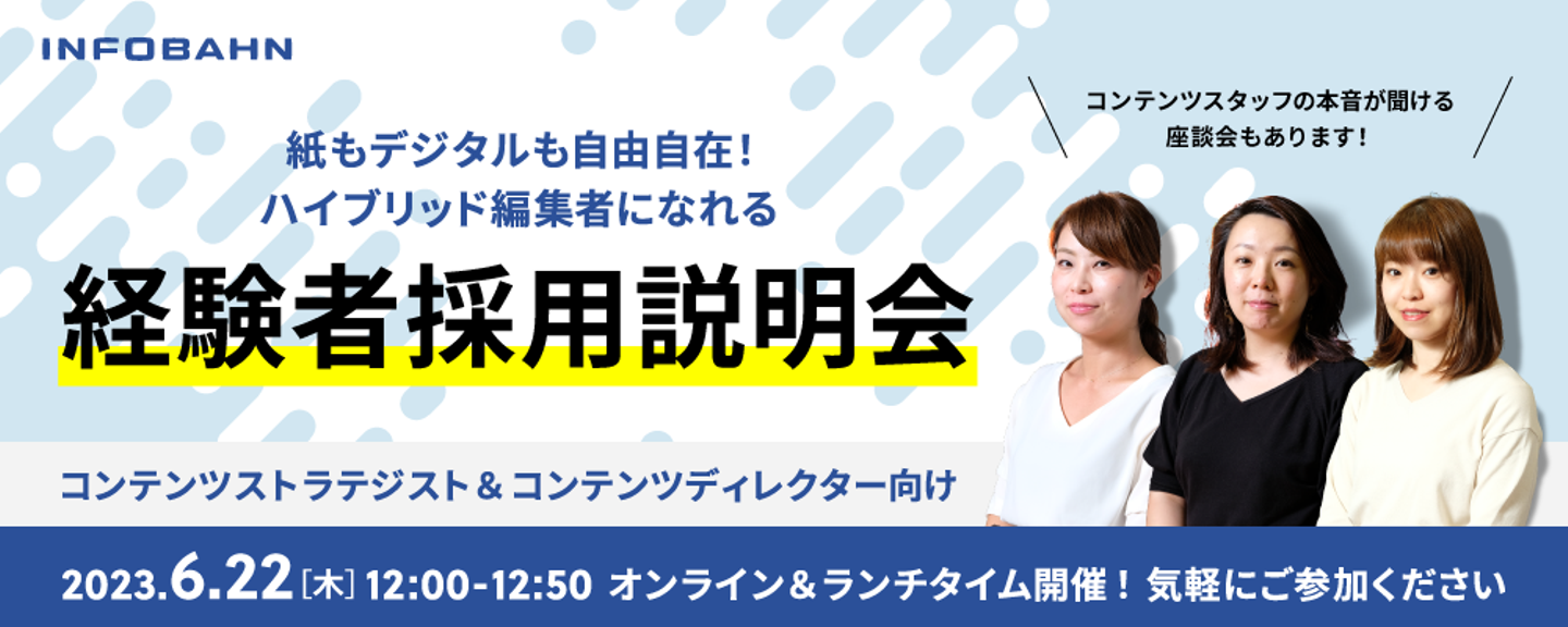 先日、経験者採用での会社説明会を実施しました。新卒採用向けに会社説明会は何度もやっていたのですが、経験者向けは初の試み。仕事をしている人でも参加しやすいように平日のランチタイムを使ってオンラインで実施いたしました。今回は求職者のみなさんに好評だったコンテンツディレクターによるパネルディスカッションの様子をお届けいたします。