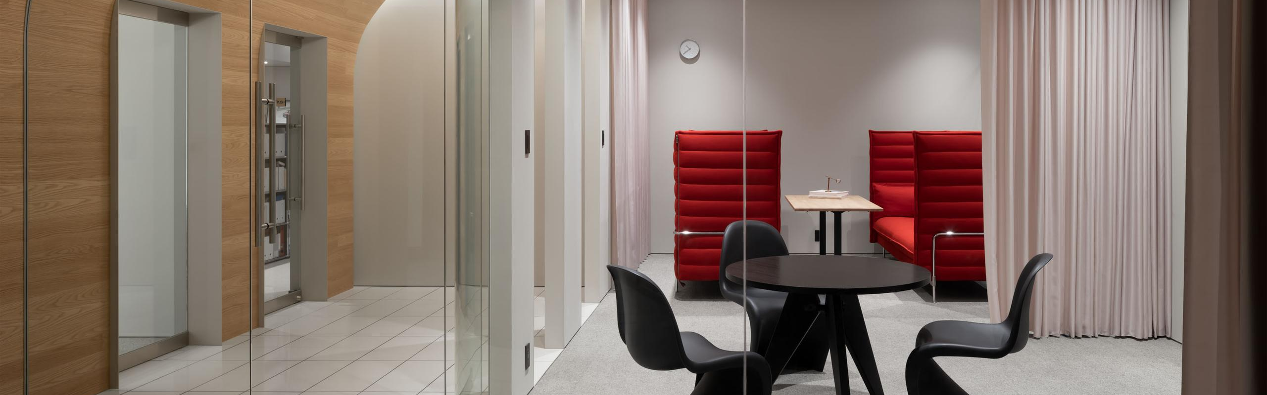オフィスを商業施設の中に作り、外観はまるで展示場のようなおしゃれなデザイナーズオフィスになっています。調光も柔らかく、カフェの中で仕事をしている感じです。