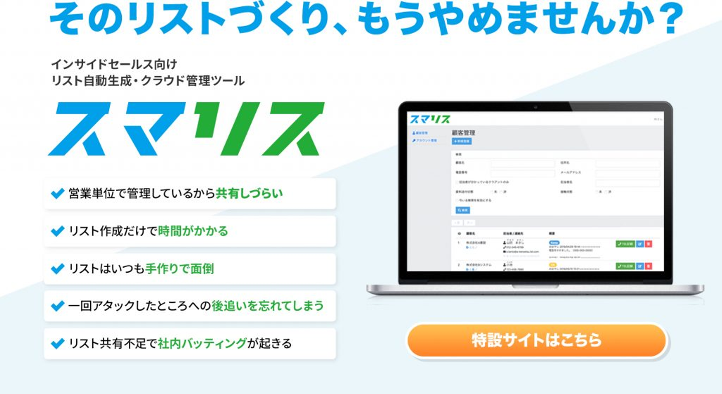 2019年5月 「そのリストづくり、もうやめませんか?」を合言葉に、営業リストの自動生成&商談獲得管理を行えるSFAスマリスの提供開始しました。