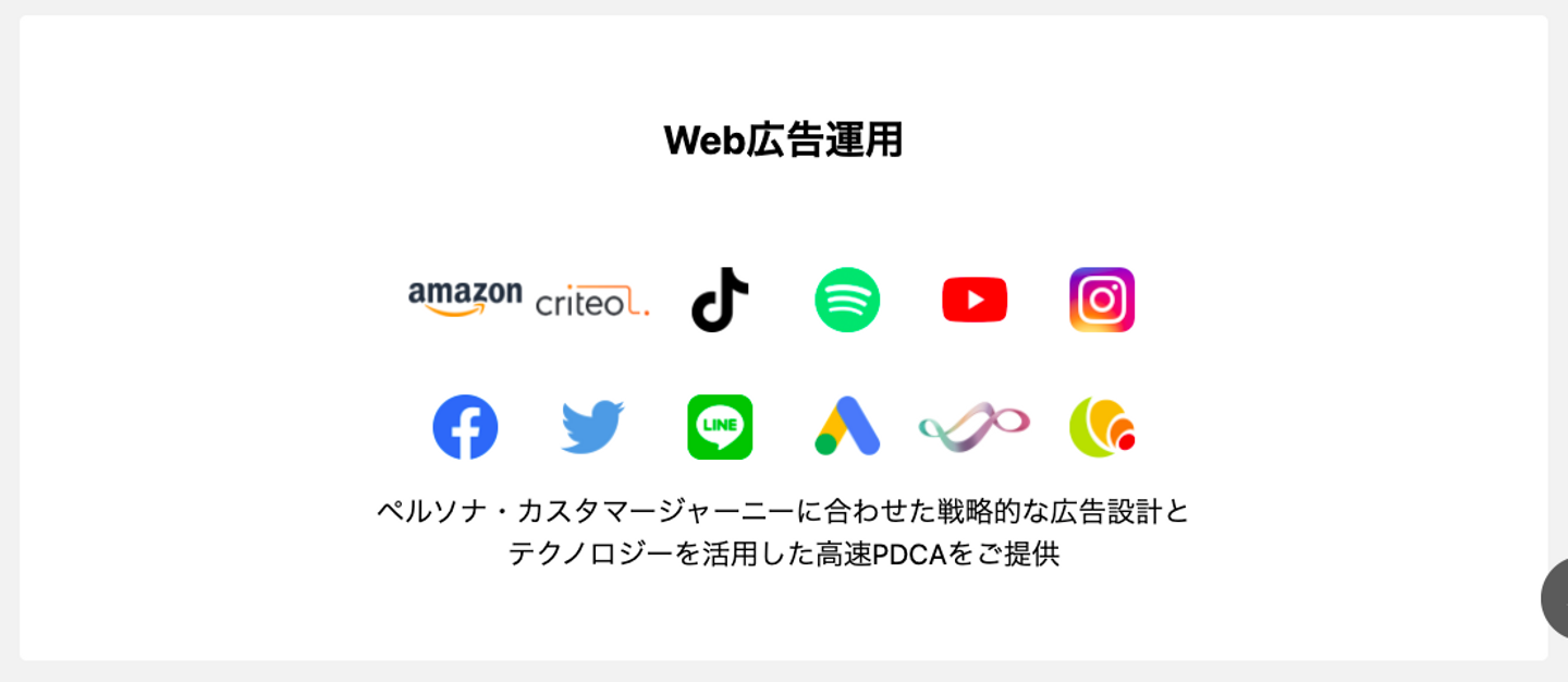 ダイナミックリターゲティングやAmazon、TIkTok、Spotifyなど、今注目の広告も新しく配信ができるようになりました。このページでは弊社で取り扱いをしているサービスの一覧が確認できます。