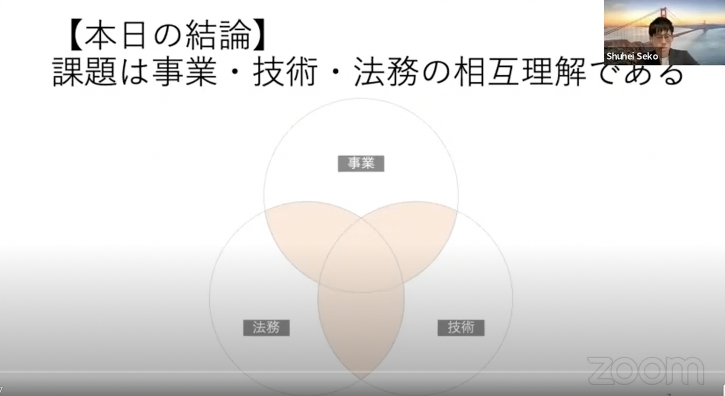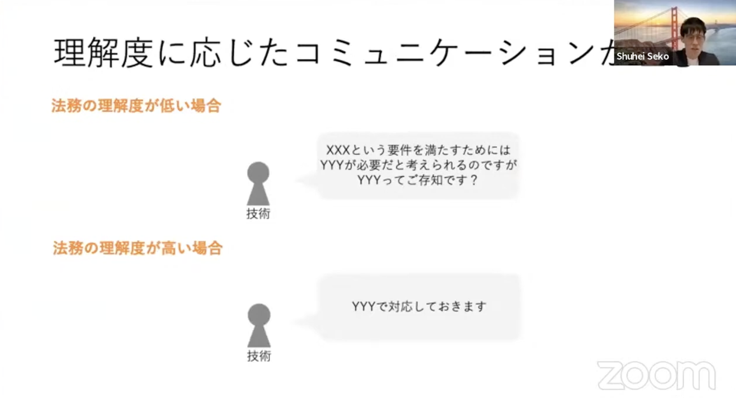 世古は具体的な会話例・書籍等を示しつつ、技術部門は法務の理解度に応じたコミュニケーションに配慮が必要であること、法務部門においても、最低限の技術知識は蓄えたうえで対話に臨むことを提案しました。