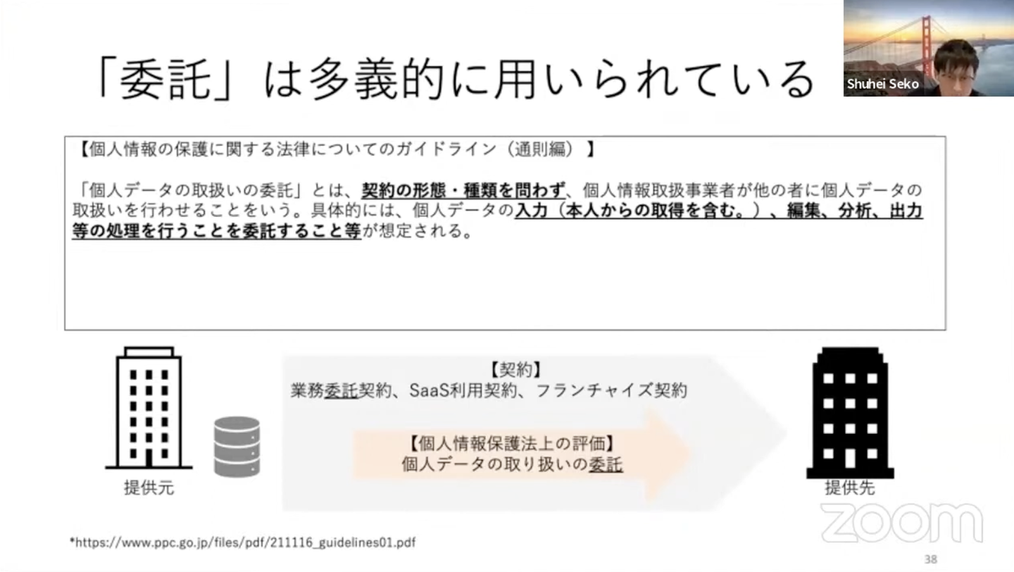 まずは、法務部門が持つ課題。誤解されやすい3つの論点「個人情報の定義」「委託」「提供元基準」についての説明がされました。