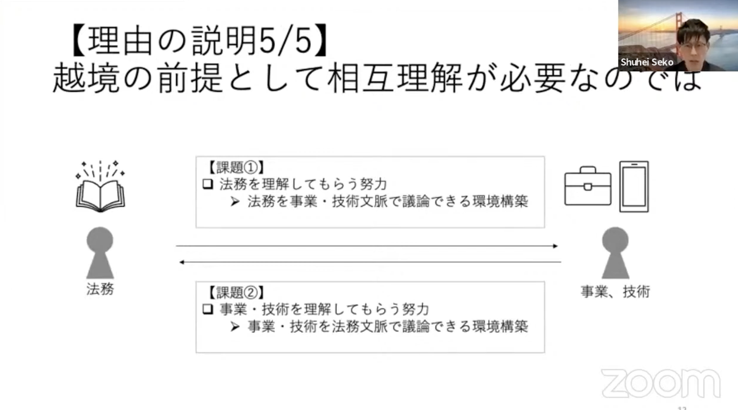 一般に弁護士がセミナーで語る「課題」は往々にして法的論点の具体を突くものですが、今回世古が取り上げたのは「部門間の理解」。インハウスロイヤーとして、日々各部門とのコミュニケーションに心を砕いていることが伺える視点と感じました。