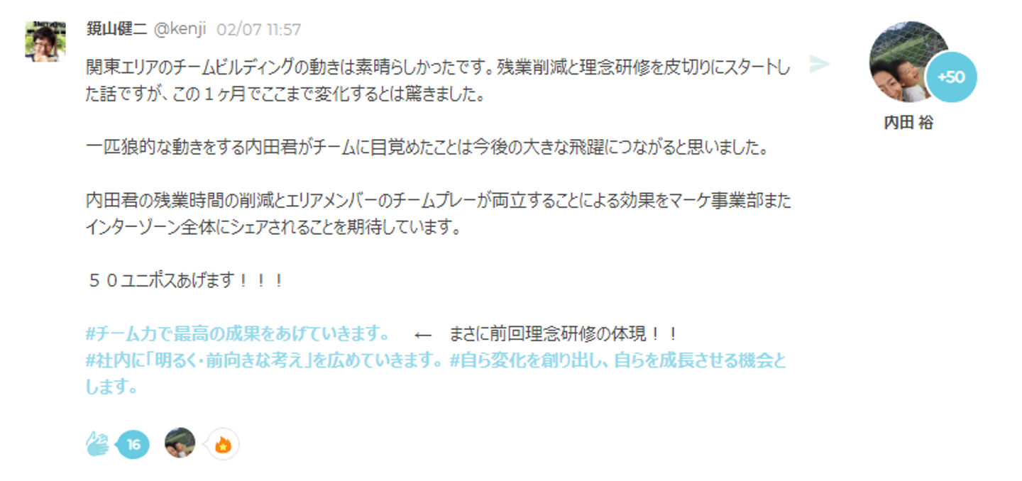 そのほか、インターゾーンでは部門横断で5~6人1組のユニポスチームがあり、その月に1番ユニポスの投稿が多かったチームを表彰する制度もあります。