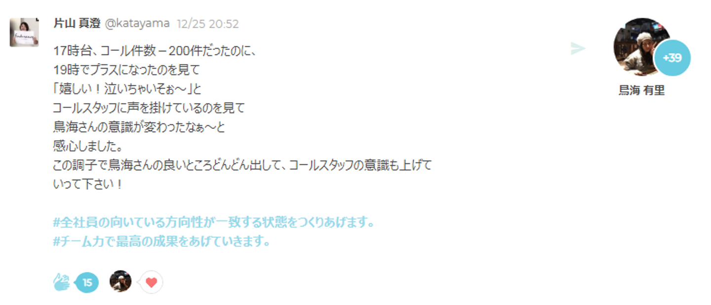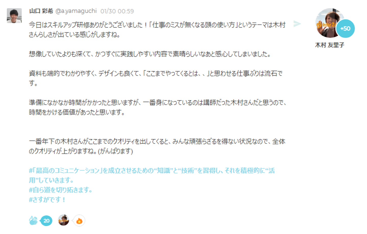 1月はシステム開発部の山口さんが同じ部署の木村さんに宛てたメッセージに20イイネがつき、山口さんが表彰されました!