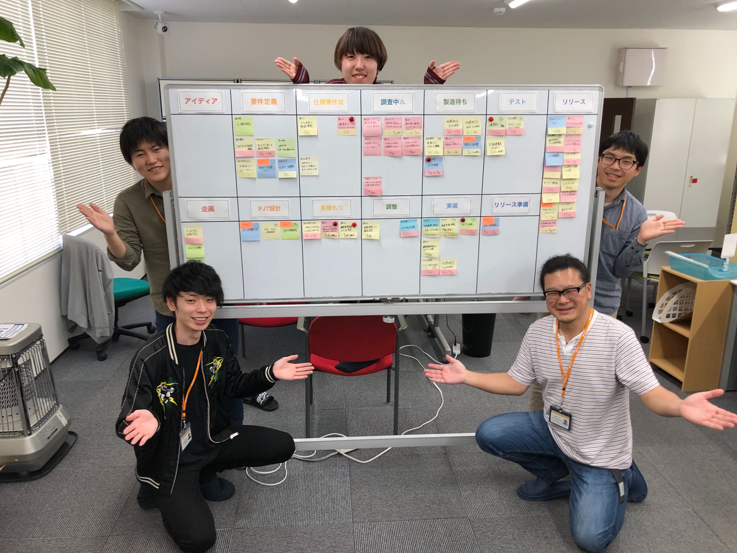 システム開発部は、去年2018年の9月に新設したばかりの新しい組織です。今年1月にエンジニアが1人増えて、現在は5人のチーム体制で進めています。メンバーは10年以上の経験を持つベテランエンジニア、今年3年目の若手エンジニア、新卒で2年目のディレクターなどさまざまです。