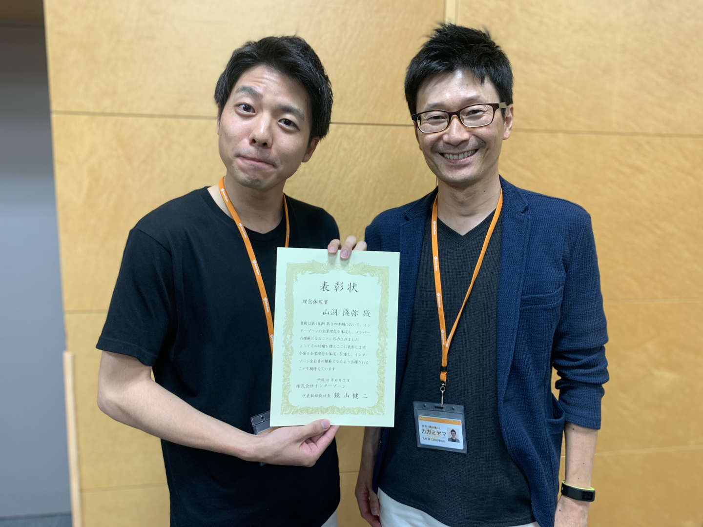 四半期に一度、インターゾーンの社内MVPに贈られる「理念体現賞」。いよいよ今年3人目の受賞となったのは、マーケティング事業部のインサイドセールス担当、関西エリアリーダーの山洞隆弥(さんどうたかや)さんです!