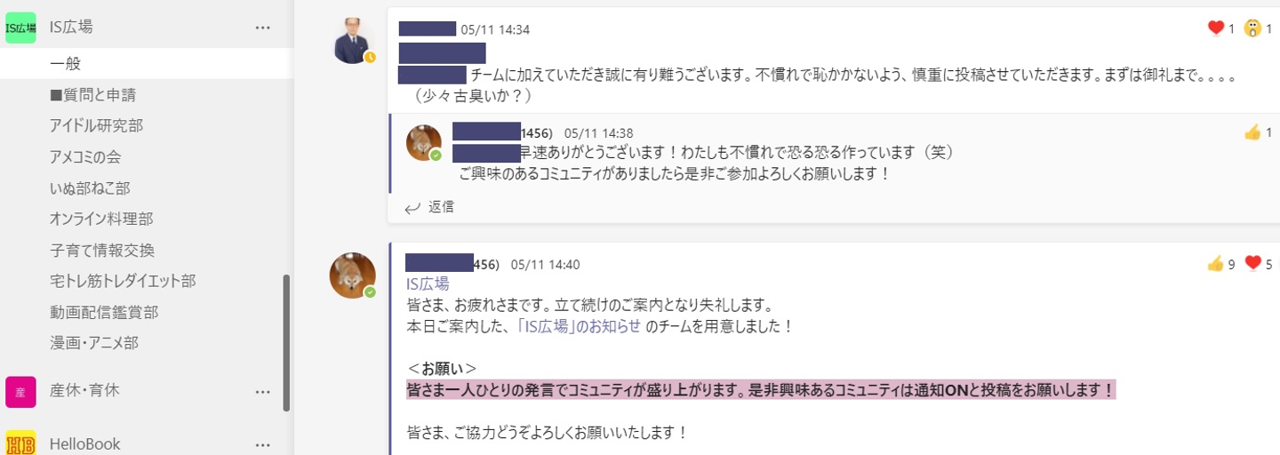 なかなか集まれないコロナ禍ということもあり、社内SNSの Teams を活用したコミュニケーション用チャネル「IS広場」を作りました。社員が興味をもってくれそうなコミュニティとして、アイドル研究部、アメコミの会、いぬ部ねこ部、オンライン料理部、子育て情報交換などのチャットがあります。
