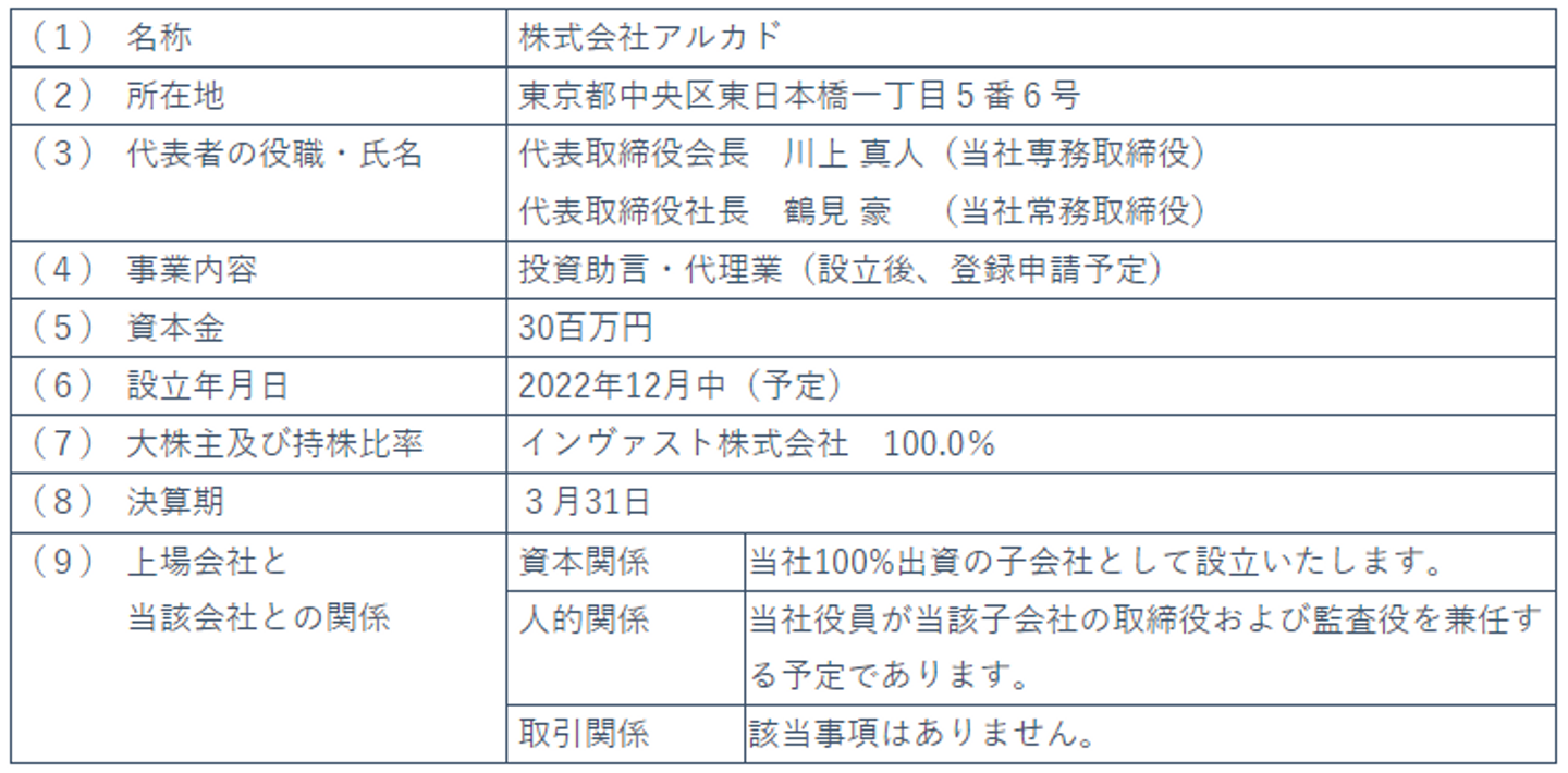 当社の子会社であるインヴァスト証券は、自動売買ソリューションの提供や、顧客の運用成績向上に資する高付加価値サービスの開発等に注力し、商品・サービスの開発・改善を継続的に行っております。こうしたグループ内のノウハウを活用することで、FX/CFD等のデリバティブ取引に限らず、高まりつつある資産形成に向けたコンサルティングやアドバイスへのニーズに対応することを目的として、新会社【株式会社アルカド】を設立いたします。