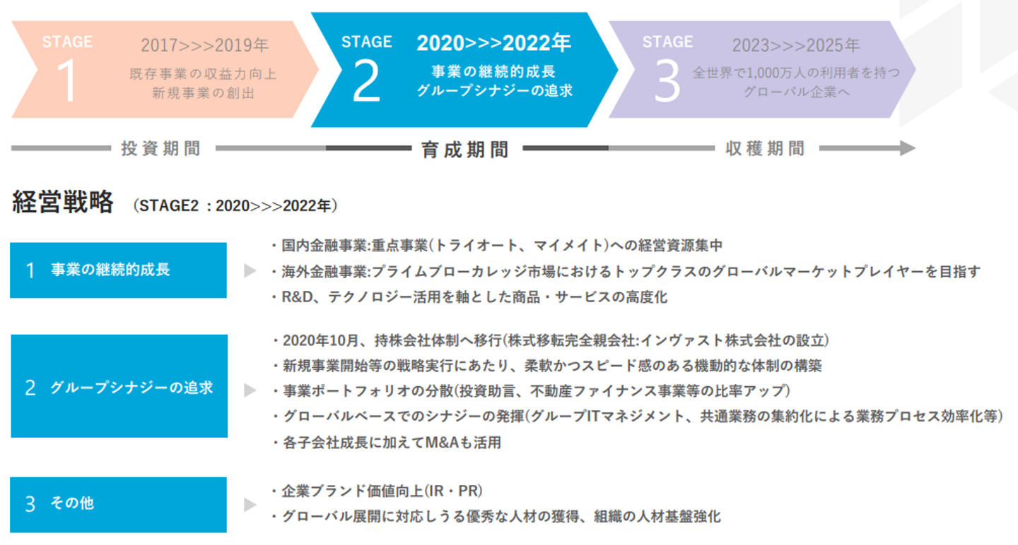 さらに「グローバルベースでのシナジーの発揮」では、Invast Global(IFS)の法人向け金融サービスをインヴァスト証券が日本国内で顧客開拓に協力するなど、進展しているんですね。以前は資金を融通しあうという限定的な形でのシナジーでしたが、STAGE2を経て、本業における顧客開拓でシナジーを生み始めていると言ってよいでしょう。