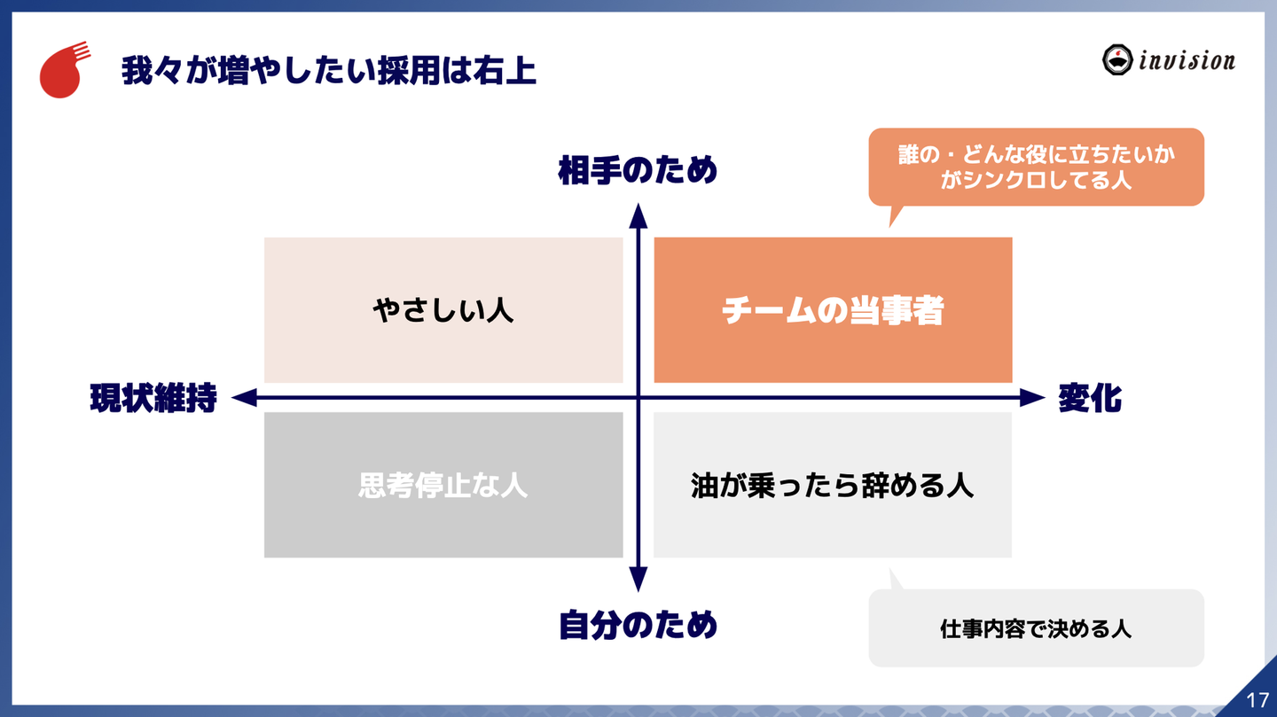 そこで今一度、先ほどの原稿を振り返ってみます。俯瞰すると、「あなたにとって働きやすい環境がありますので、どうかうちに来てください」と言わんばかりの、求職者に迎合するような内容だと気づきます。するとどうでしょう。下の図でいう左下の人ばかりを引き寄せるのも、当然のような気がします。前提、誰しも所属するチームによって右上にも右下にも左上にも左下にもなり得ると思っています。例えば私はインビジョンでは右上だと思うけれど、別のチームでは左下になるかもしれません。誰のどんな役に立ちたいか?という会社のベクトルが、会社と自分とで同じかどうか否かで、誰しも変わる余地はありそうです。