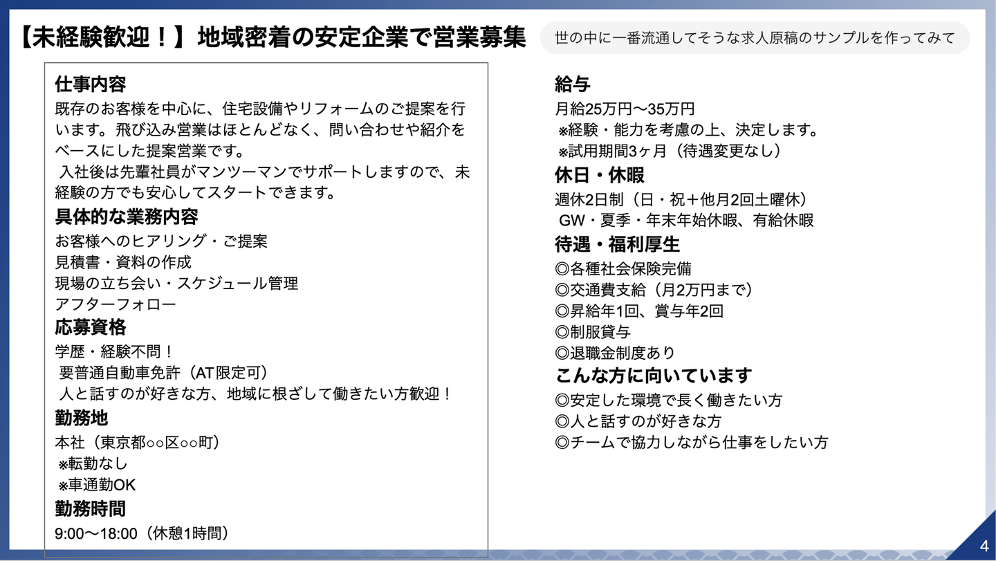 スタンスの問題点がはっきりしたことで、より課題をはっきりさせようと行き着いたのは、出会いのきっかけ、求人原稿の内容でした。当時の求人原稿をひっぱり出せるとよかったのですが、惜しくも断捨離済みだったので、ここはchatGPTに力をかります。