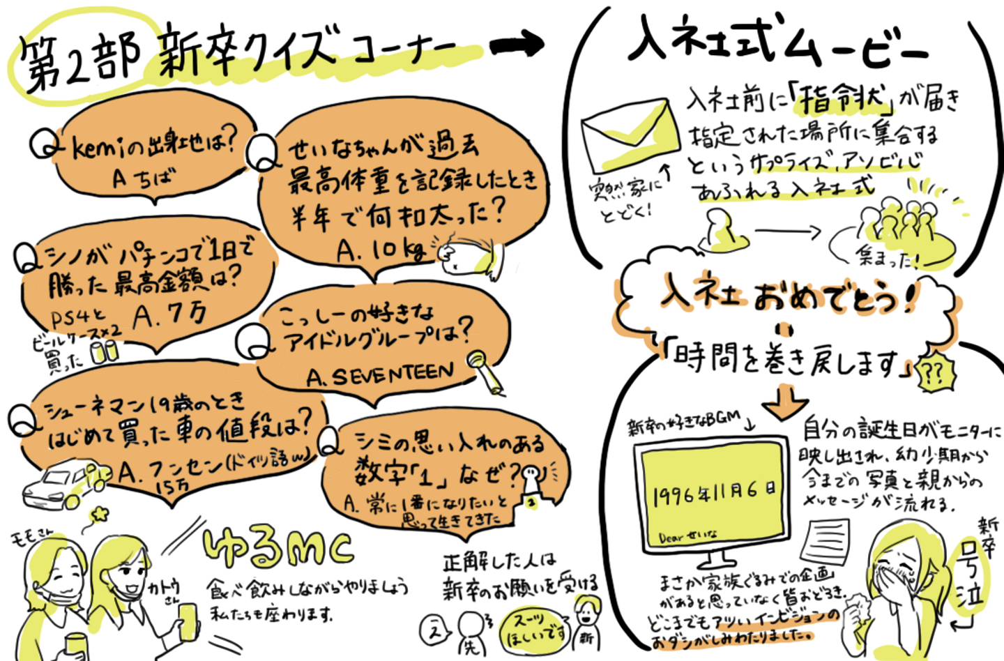 まったりしてきた第2部は、ゆるい先輩プレゼンツ新卒クイズコーナーと入社式ムービーがありました。