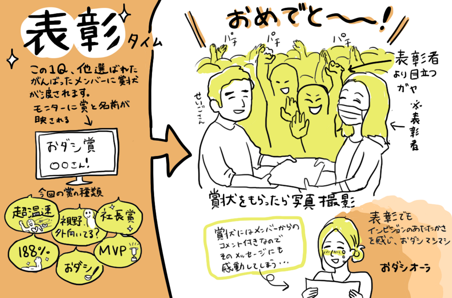 いろんなカテゴリーがありそれぞれで頑張ったメンバーにおダシメッセージ付きの賞状が渡されます。