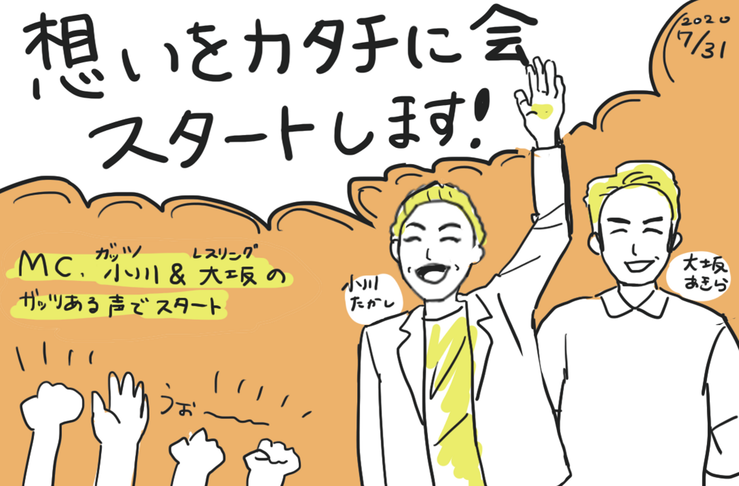 今回の想いをカタチに会の司会は、社内イチ爆弾ボイスの小川さんと元レスリング選手のあきらさんです。小川さん、めっちゃ声大きいんです…。正直、他のフロアに響いてないか心配しました。