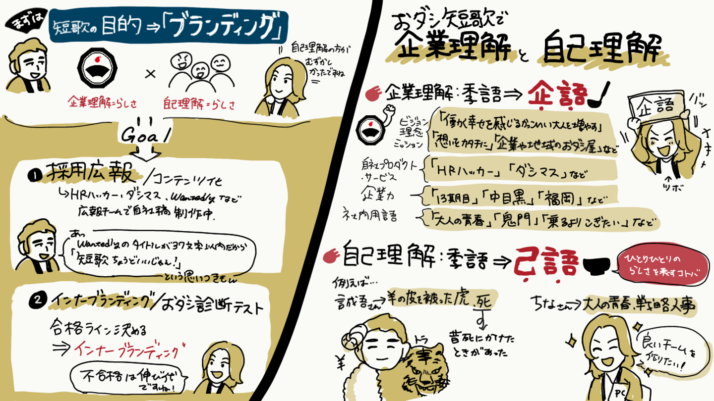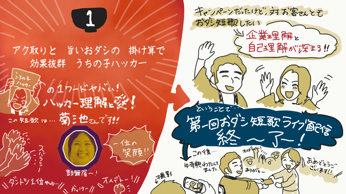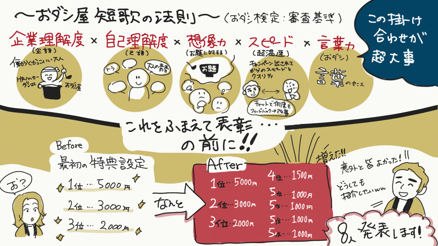 おダシ短歌の審査基準は、「企業理解度(企語)」×「自己理解度」×「想像力(お題に対する)」×「スピード(超温速)」×「言葉力(おダシ)」の掛け合わせが出来ているかというところを見られていました!
