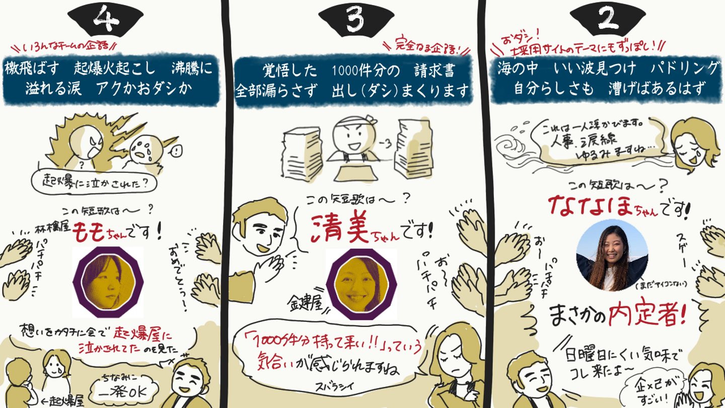 2位はまさかの内定者!そう、このおダシ短歌は社員だけじゃなくインターン生や内定者も対象です。