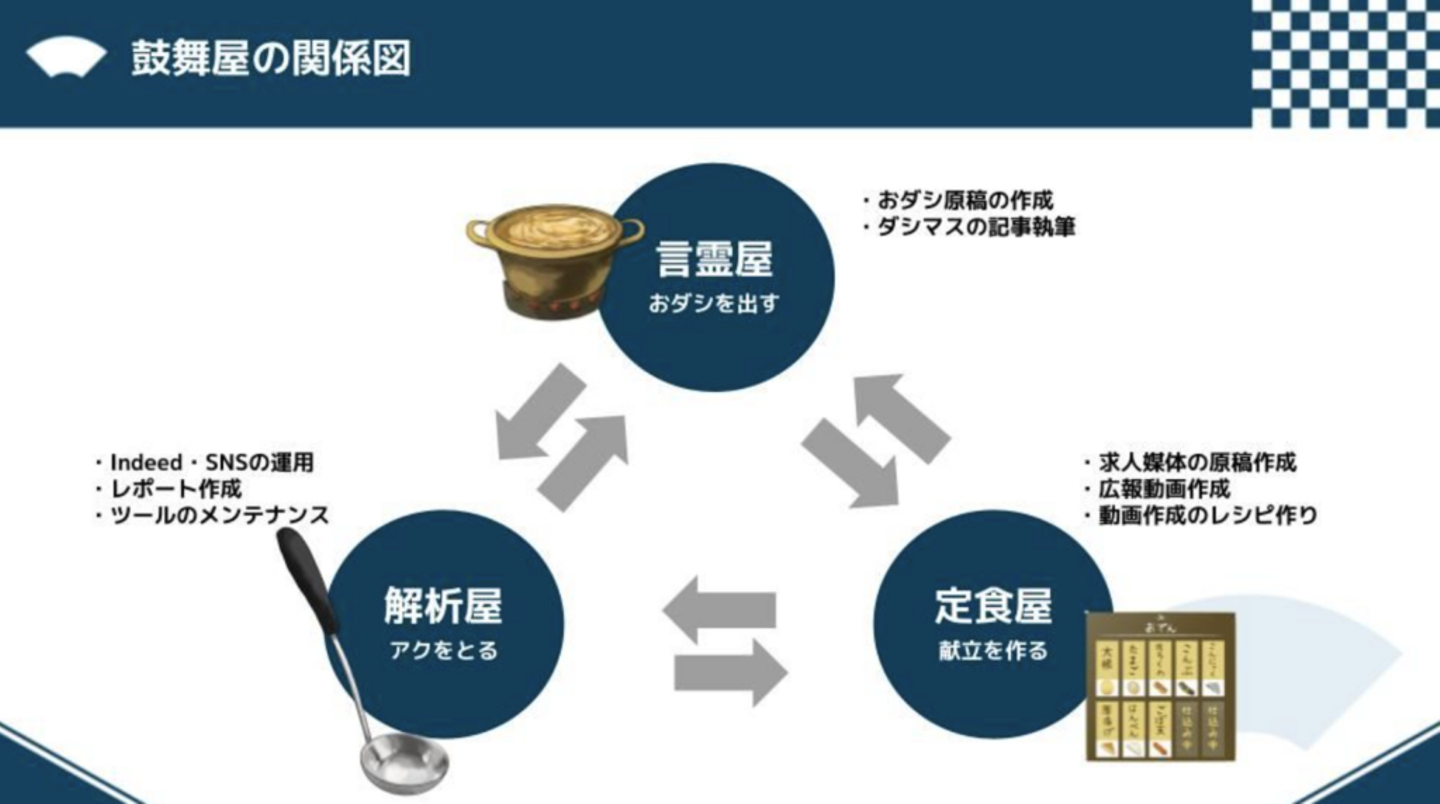 ざっくり分けると、鼓舞屋はさらに3つの役割に分かれます。