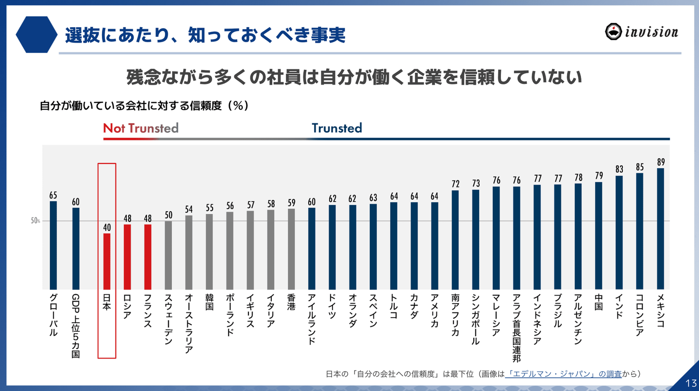 日本の「自分の会社への信頼度」は最下位(画像は「エデルマン・ジャパン」の調査から)