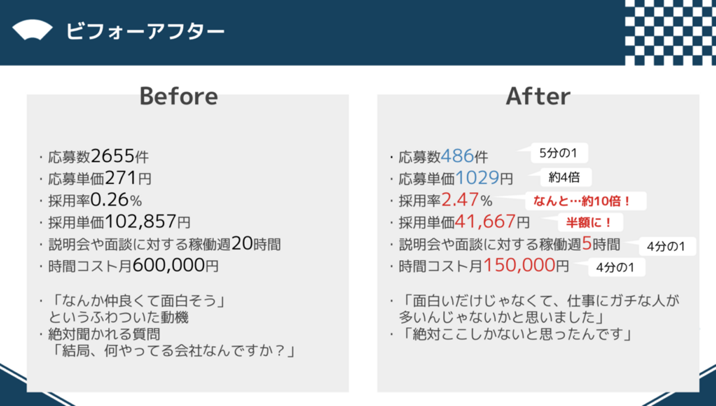 表面的な見える部分だけを変えても、根っこの解決にはなりません。もしかすると応募の数は増えるかもしれないですが、本質的なマッチングには至りません。 「そこに愛はあるんか?」と同じで、「そこに想いはあるのか?」です。