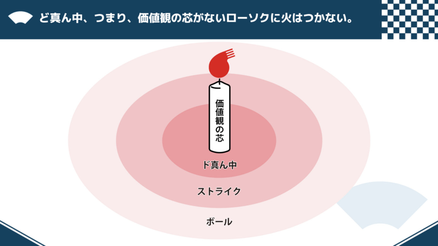 求人原稿を書く前に、コンテンツを出す前に、採用サイトを作る前に、一番大切な揺るぎないど真ん中の軸を、まずは明確にするべきなのです。 真ん中を明確にした上で、採用戦略を練り、採用広報コンテンツを充実させれば、本当にマッチする運命の誰かと出会える確率がグッと上がるのです。これは、私自身に向けても言っています。