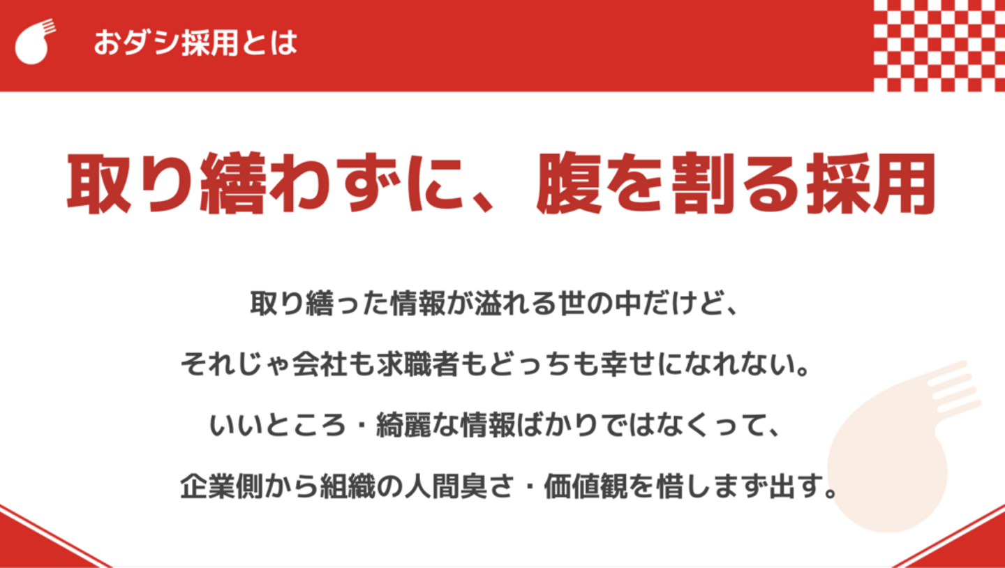 どんな価値観を持って、何をやっている会社なのか?=揺るぎない「会社のど真ん中」を明確にし、それを惜しみなく発信する。私たちに足りていなかったのはこれでした。そんな採用のことを、私たちは「おダシ採用」と呼んでいます。おダシとはその会社が持つ唯一無二の魅力のこと。 私たちは会社の正体を明らかにできていないまま、情報を発信していたわけです。そりゃあ、いい採用ができなかったのも無理はないですね。