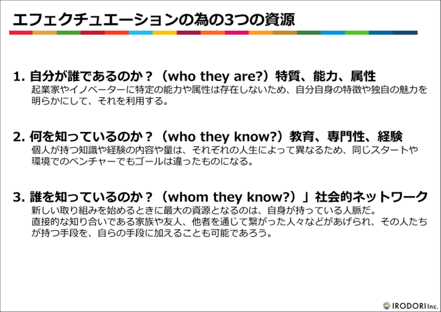 現代の優れた起業家に共通する意思決定プロセスや考え方を発見し、体系化されたものとのこと。それは「自分が持っている手段から新しいゴールを発見していくこと」とされています。