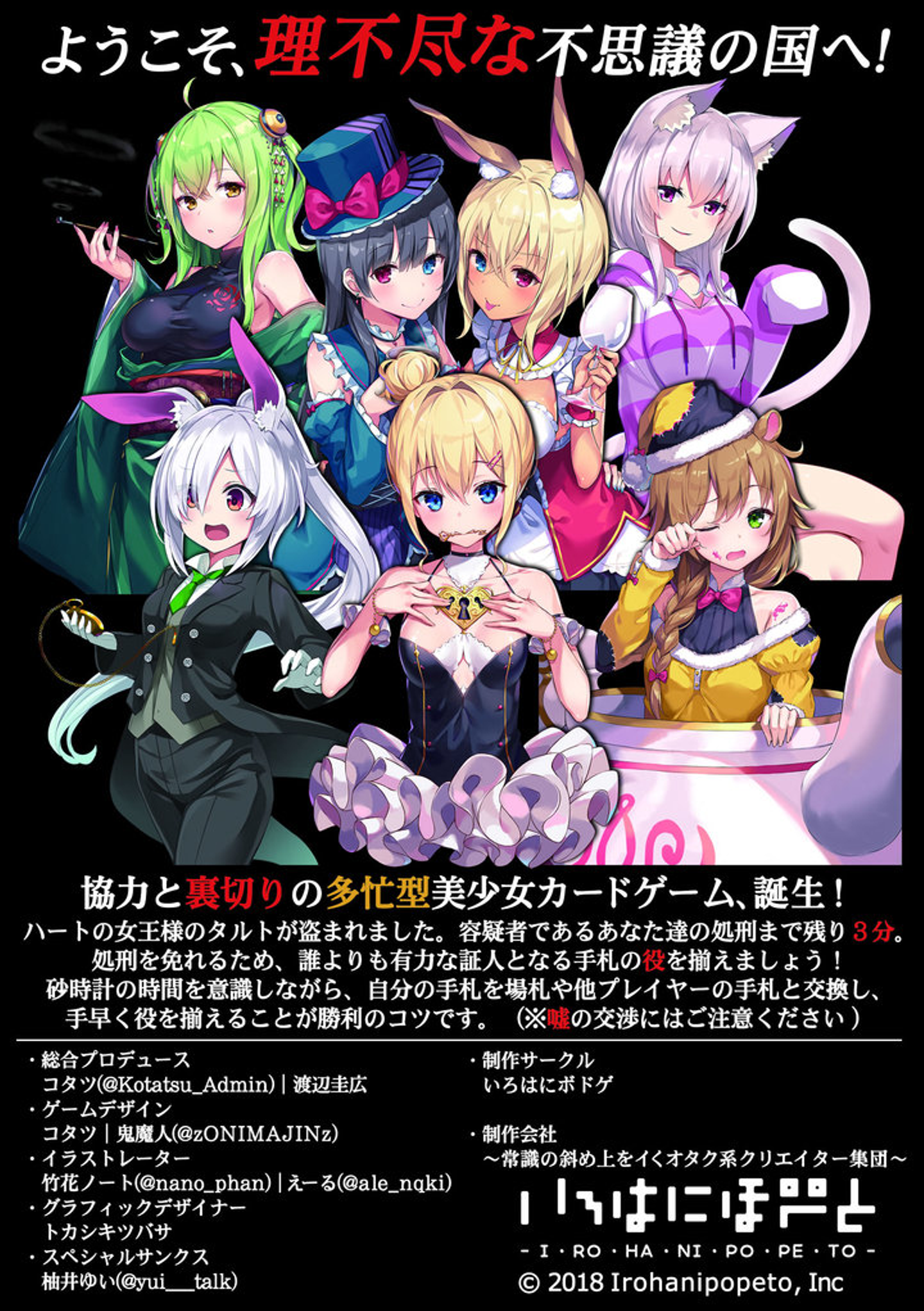 常識の斜め上をイくオタク系クリエイター集団:株式会社いろはにぽぺと(本社:東京都港区、代表取締役:渡辺圭広 http://irohanipopeto.com )は、2018年11月24日、アナログゲームイベント「ゲームマーケット2018秋」にて、協力と裏切りの多忙型超絶美少女カードゲーム【不思議の国のアリス~理不尽な女王裁判~】を販売いたします。