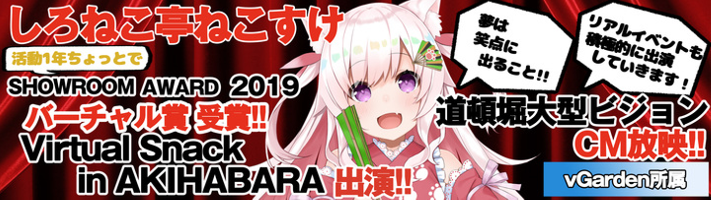 常識の斜め上をイくオタク系クリエイター集団:株式会社いろはにぽぺとグループ 株式会社いろはにぽぺと・異世界系譜のvGarden(本社:東京都渋谷区、代表取締役:渡辺圭広 以下「当社」http://irohanipopeto.com/ )は、所属バーチャルタレント「しろねこ亭ねこすけ」が2019年の活躍が認められ『SHOWROOM AWARD 2019』バーチャル賞を受賞したことをお知らせ致します。