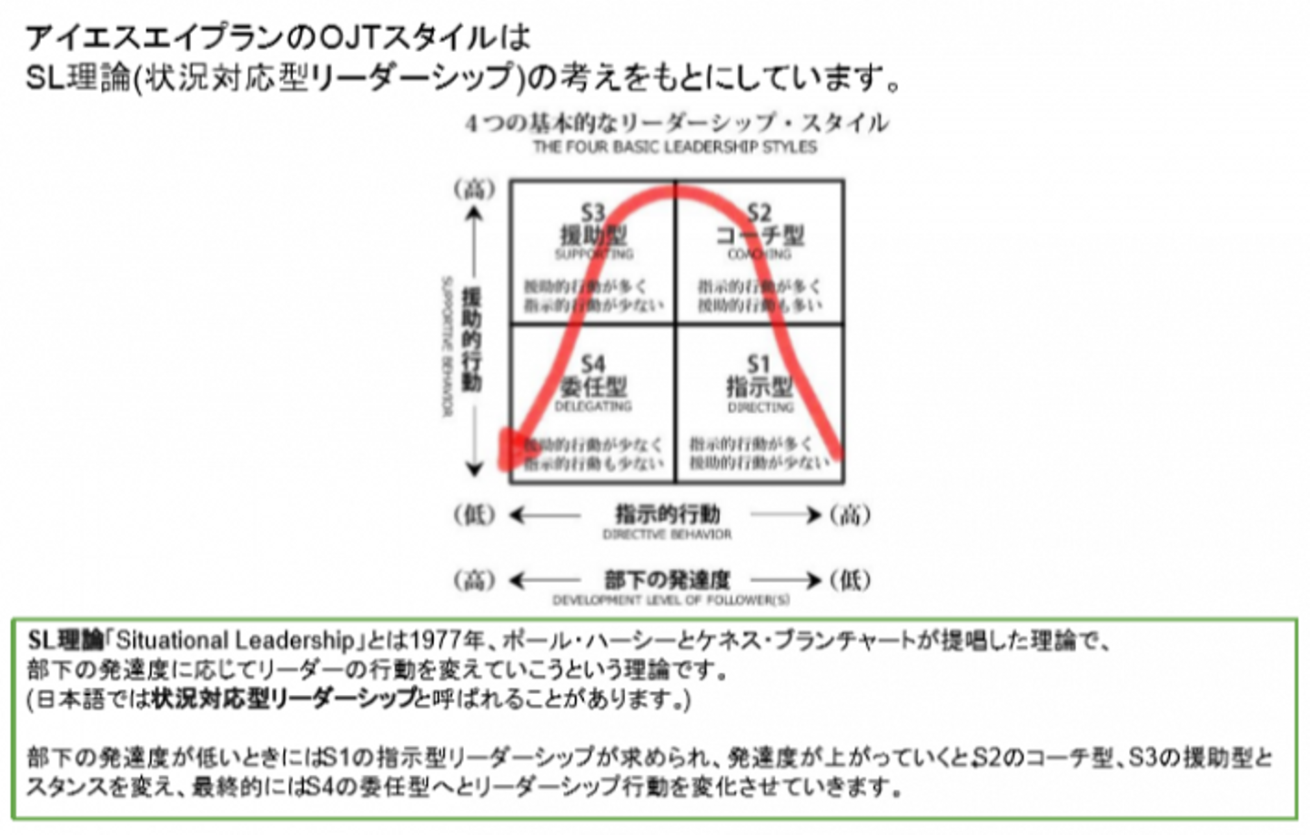 アイエスエイプランでは、SL理論と呼ばれる状況対応型リーダーシップに沿ってOJTを実施しています。