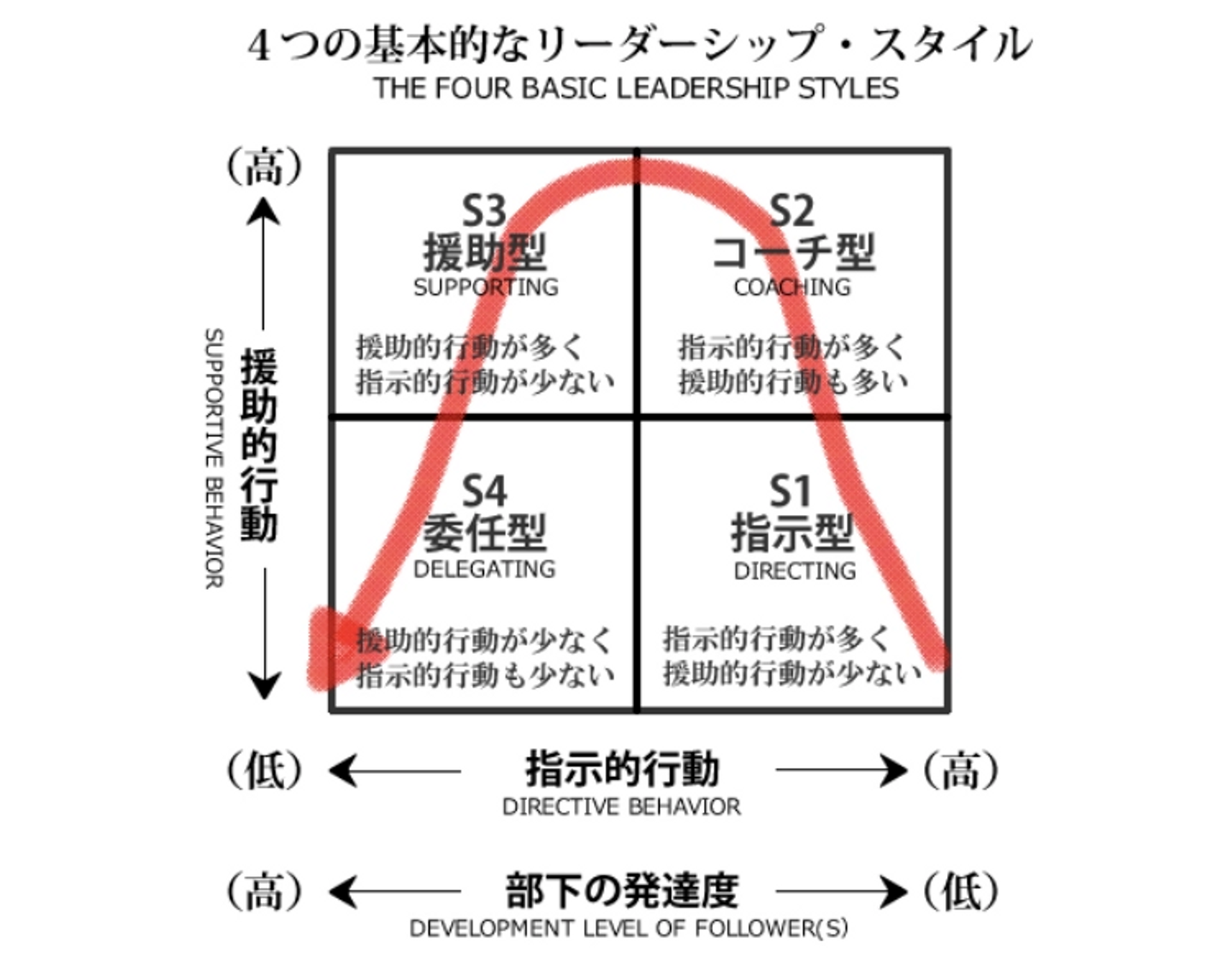 SL理論ではいわゆる部下の習熟度が低い場合には、「S1:指示型」から始まり、習熟度があがるにつれて「S2:コーチ型」「S3:支援型」「S4:委任型」と象限が変化していき、「援助的行動」と「指示的行動」との按分率が変化していきます。