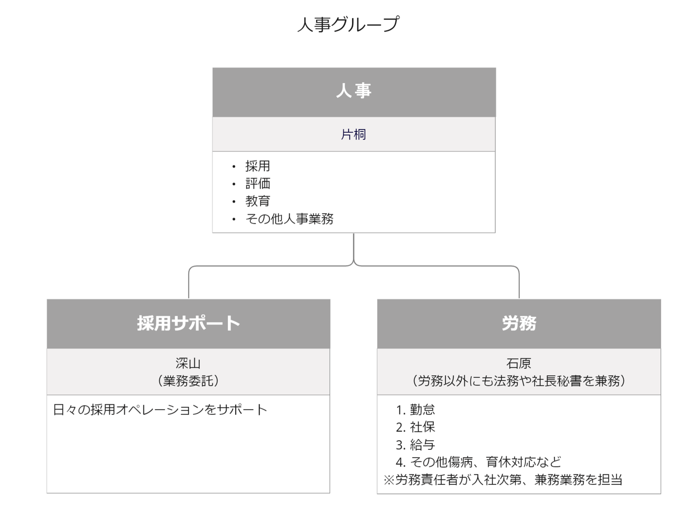 現在人事グループは3名体制(2名正社員、1名業務委託)。2023年度には労務責任者と人事担当を増員し、3~4名体制で150人規模の組織として事業が円滑に運営されるように採用を行っています。