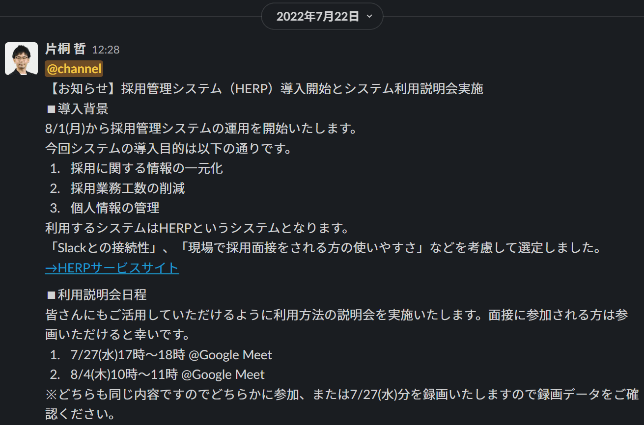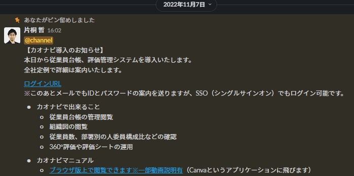Slackでのカオナビ導入のアナウンス。既に従業員が100名近くいたため、データ移行が大変でしたが導入工数以上のメリットがありました。