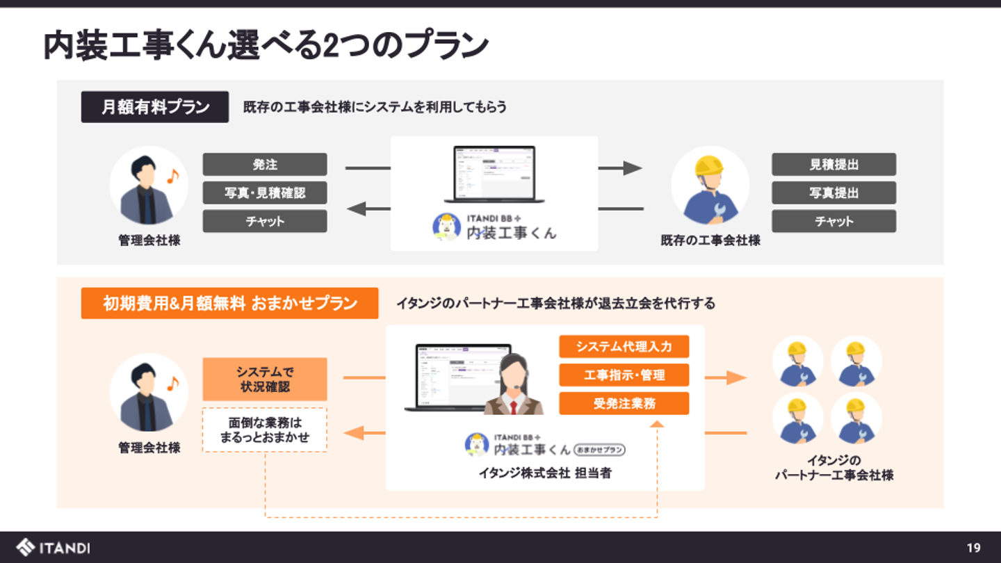 当初は、オンライン上で現状回復工事の進行管理や発注を可能にするSaaSとしてスタートしました。その後多数の管理会社からのリクエストを受け、イタンジのカスタマーサクセスがシステムへの入力や工事指示・管理、受発注業務などを代行する「おまかせプラン」をリリースしました。管理会社の業務プロセスをデジタルに置き換えるだけではなく、イタンジのオペレーションによって管理会社の要望と工事会社の強みや特徴を最適に管理することができます。イタンジを介したリアルなやり取りを組み合わせることによって、システムだけでは解決できない課題を解決していきます。
