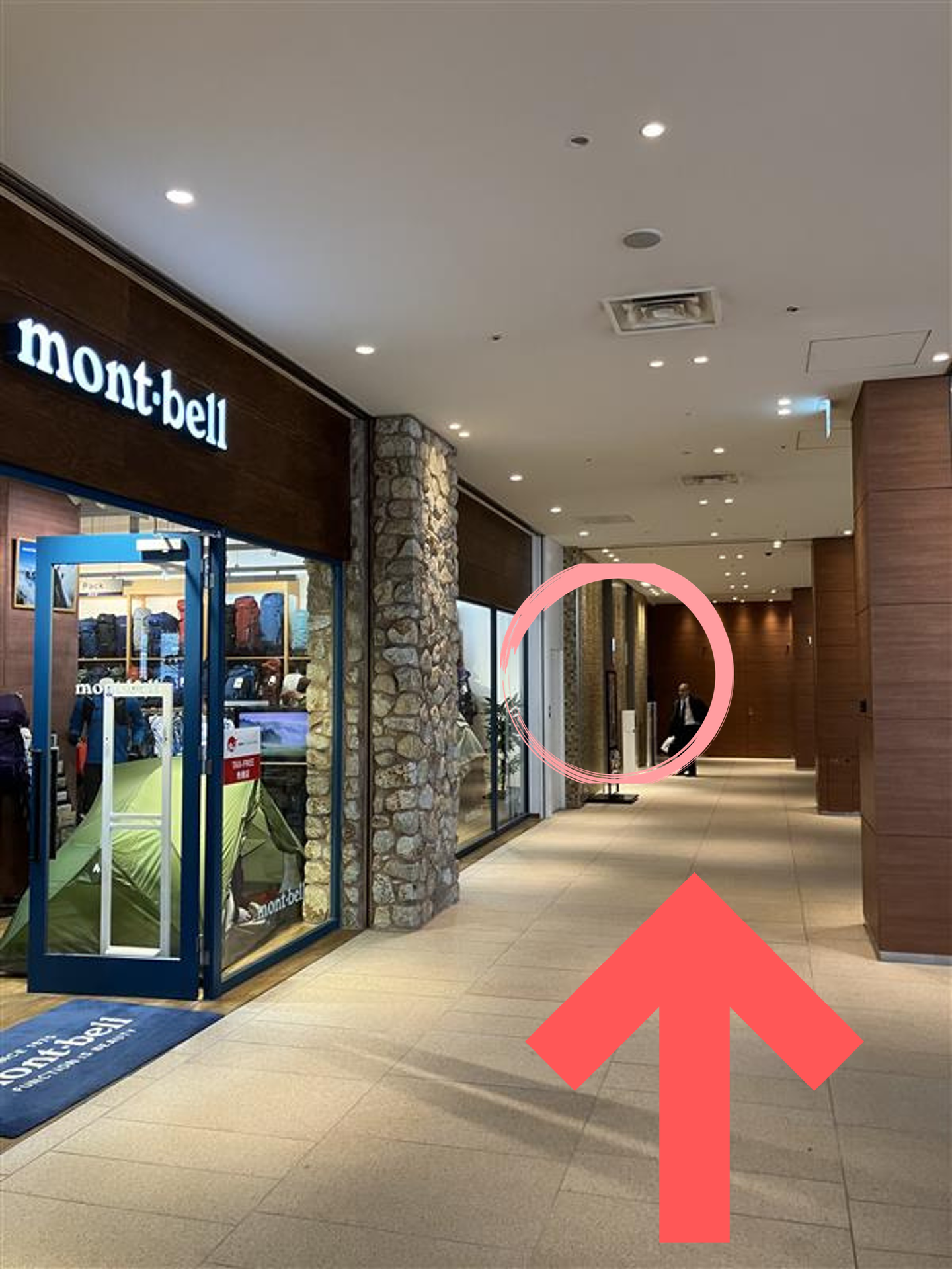 中に入るとモンベルさんの店舗がありますので、そのまま奥へ進んでください。