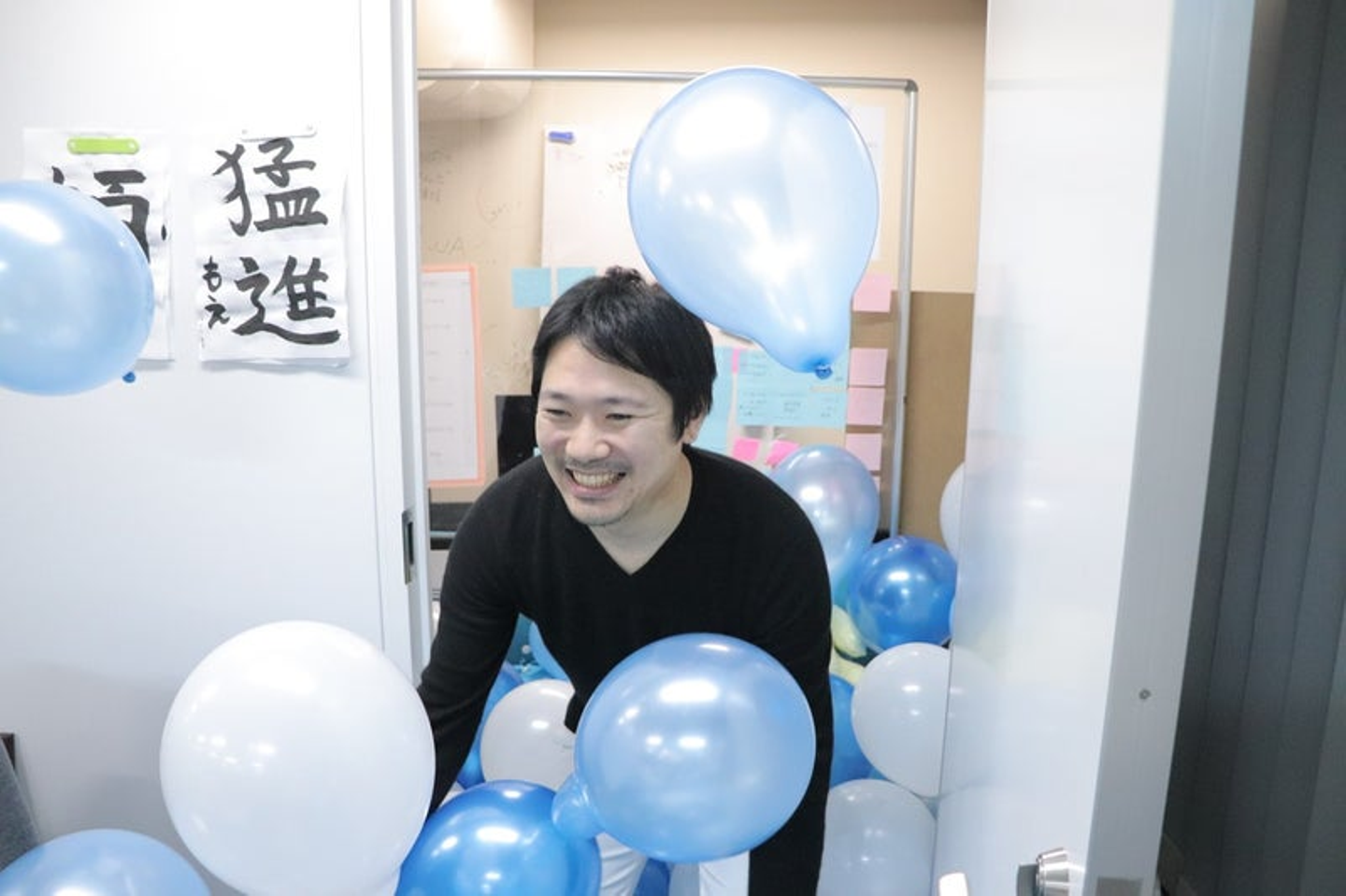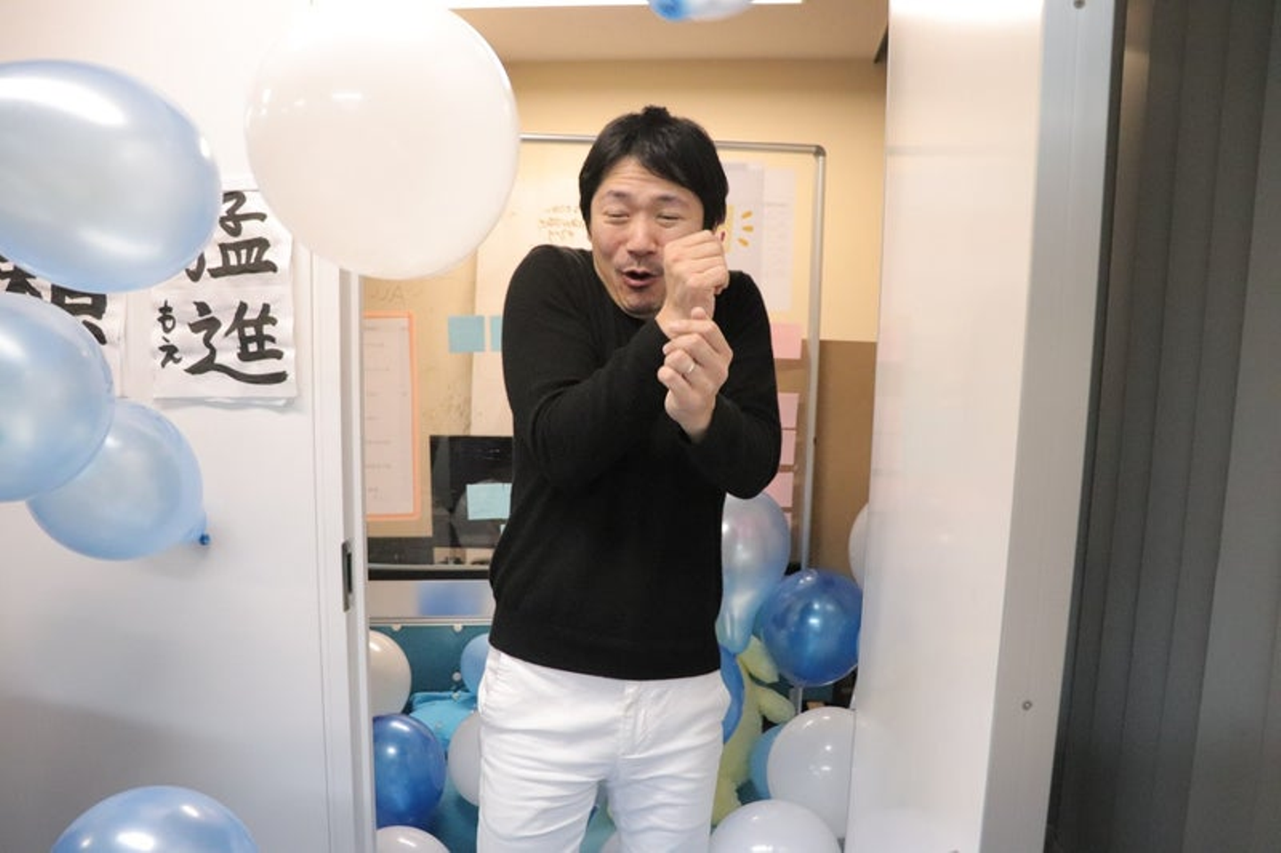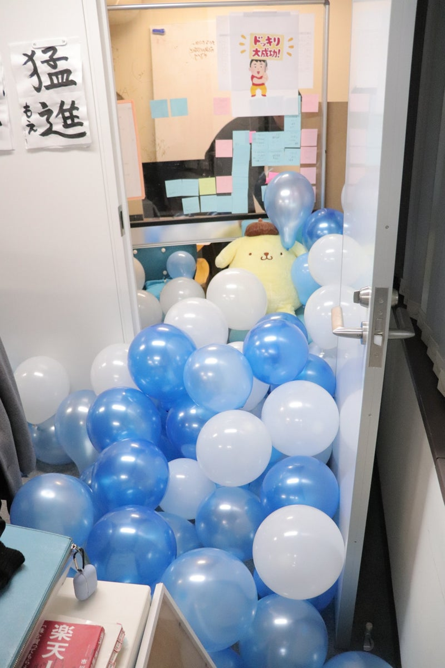 社長室を開けたら大量の風船が雪崩のように落ちてくる。風船ドッキリ!