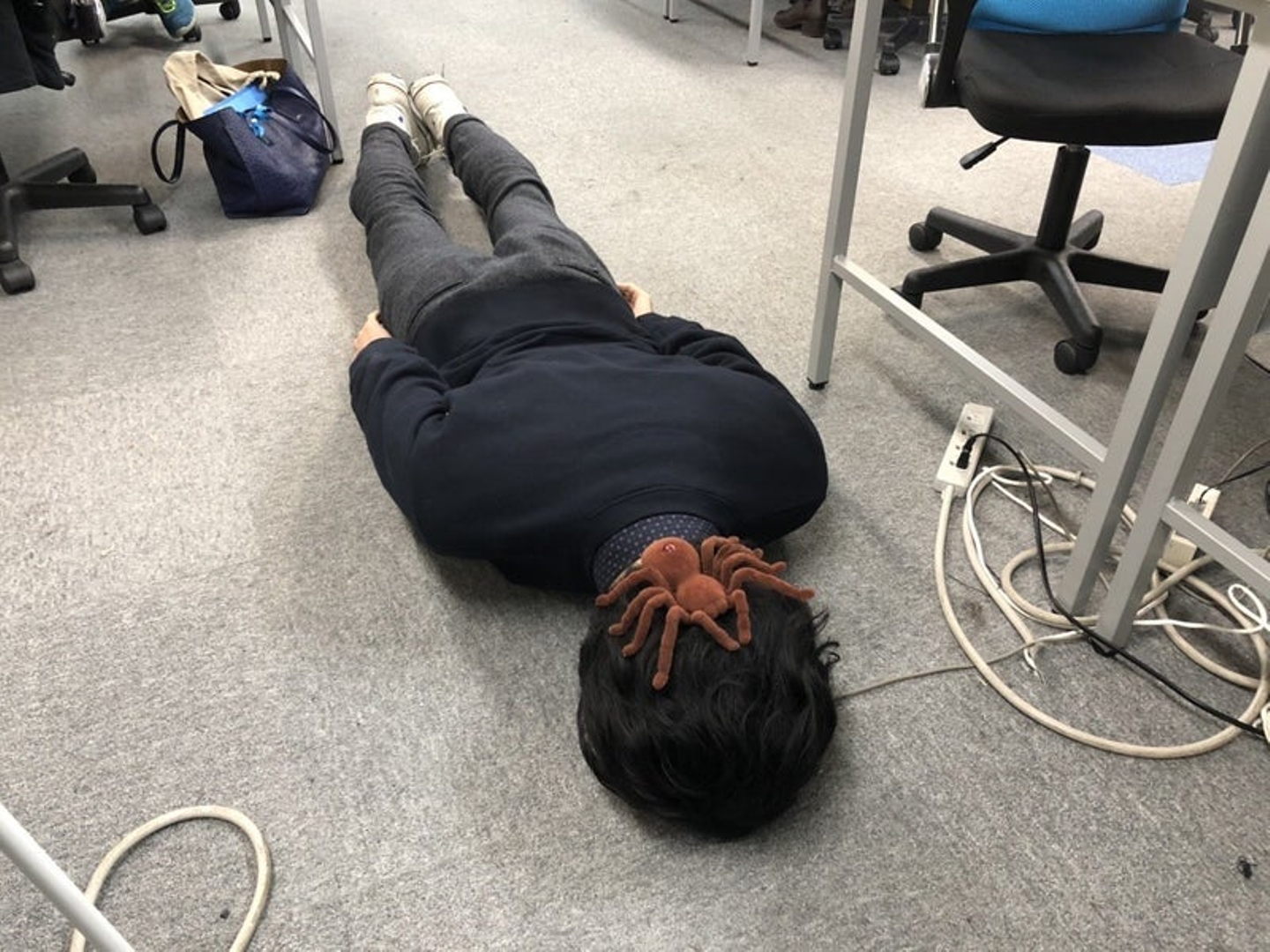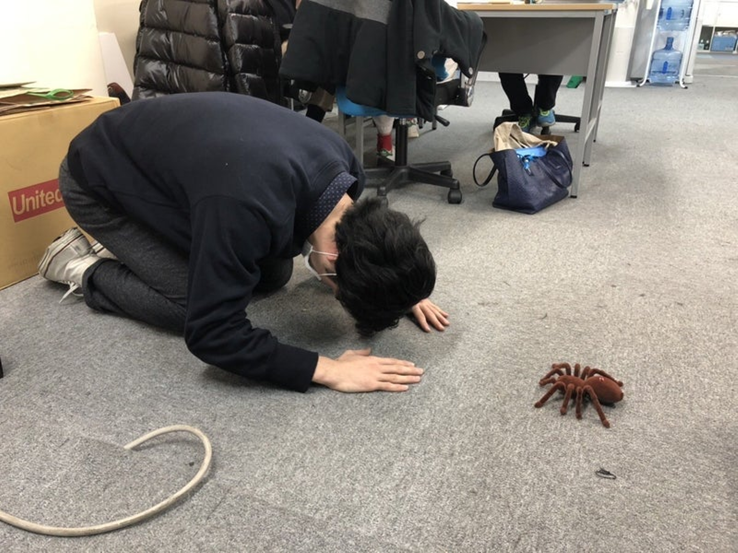 椅子の下にクモ隠しさ。話ている途中にさ。リモコン操作して足元からクモ出てくる流れだったのにさ。