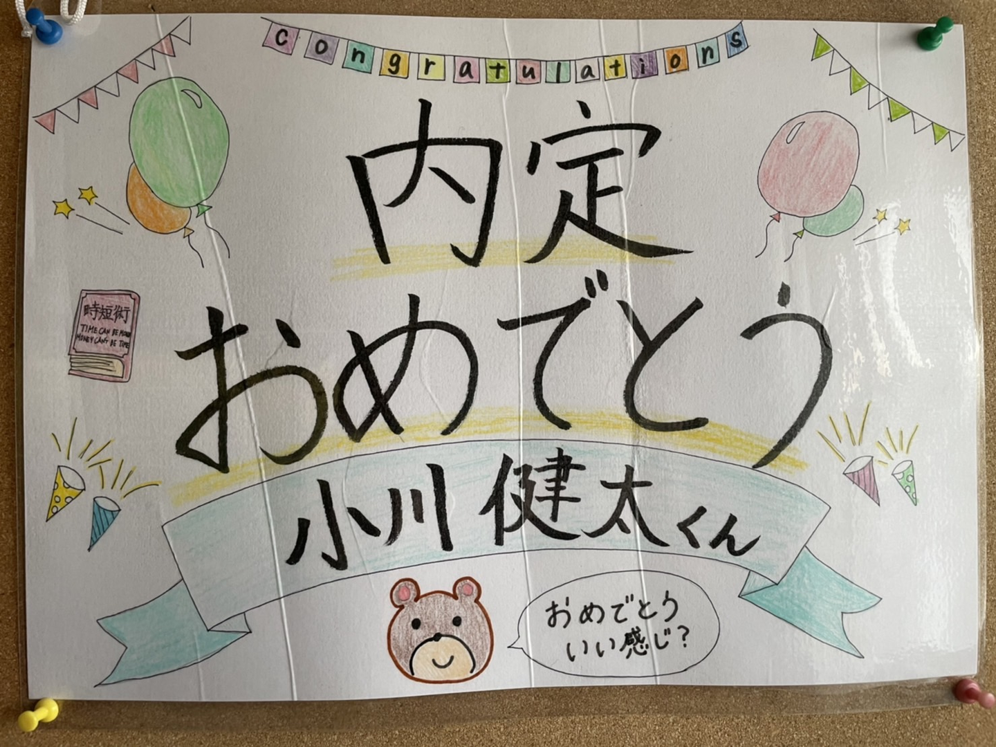 結果発表の日はものすごくドキドキしたんだけど、社員の方総出で「内定おめでとう」の文字とともに祝ってくれて、喜びを超えた言葉にならない感情で久しぶりに涙が出た。
